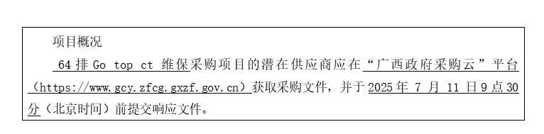 簡要規格描述或項目基本概況介紹、用途:64排Go top ct 維保1項。如需進一步了解詳細內容,詳見競爭性磋商文件。